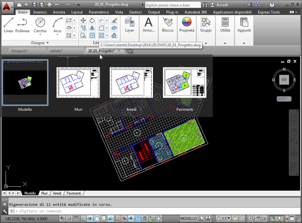 Dall’elenco schede si possono creare nuovi DWG (pulsante +), chiudere un disegno (con la x) oppure passare da un file all’altro e anche da un layout all’altro, se si lascia comparire l’anteprima soffermando il mouse.